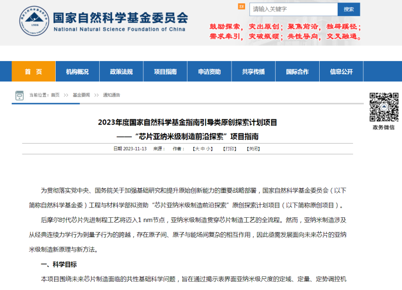 为贯彻落实党中央、国务院关于加强基础研究和提升原始创新能力的重要战略部署,国家自然科学基金委员会(以下简称自然科学基金委)工程与材料学部拟资助“芯片亚纳米级制造前沿探索”原创探索计划项目(以下简称原创项目)。