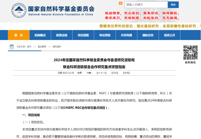 根据国家自然科学基金委员会(以下简称自然科学基金委,NSFC)与香港研究资助局(以下简称研资局,RGC)关于设立联合科研资助基金的协议,双方每年联合资助内地与香港科学技术人员开展合作研究。现征集2024年度联合科研资助基金合作研究重点项目(以下简称NSFC-RGC合作研究重点项目)。