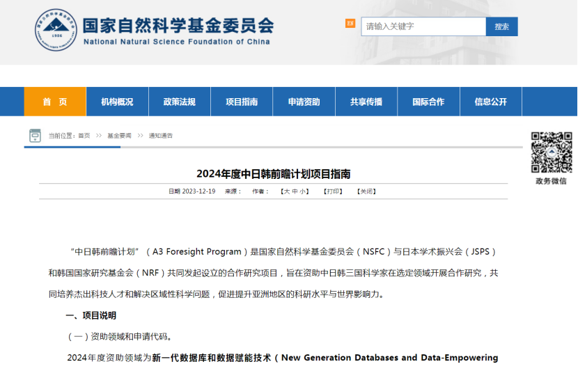 “中日韩前瞻计划”(A3 Foresight Program)是国家自然科学基金委员会(NSFC)与日本学术振兴会(JSPS)和韩国国家研究基金会(NRF)共同发起设立的合作研究项目,旨在资助中日韩三国科学家在选定领域开展合作研究,共同培养杰出科技人才和解决区域性科学问题,促进提升亚洲地区的科研水平与世界影响力。
