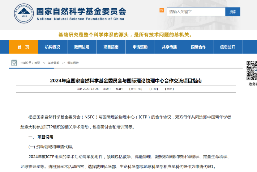 2024年度国家自然科学基金委员会与国际理论物理中心合作交流项目指南