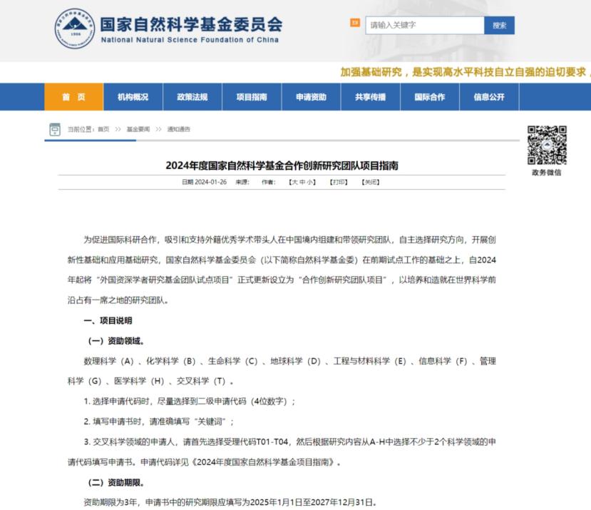 2024年度国家自然科学基金合作创新研究团队项目指南