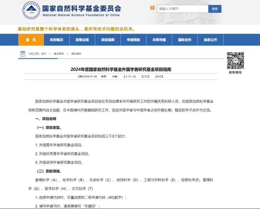 2024年度国家自然科学基金外国学者研究基金项目指南