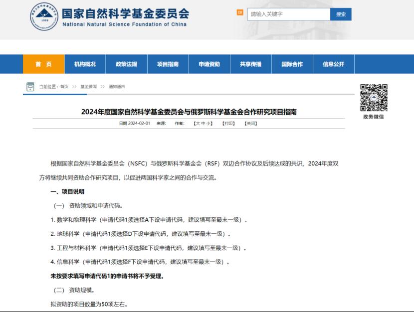 2024年度国家自然科学基金委员会与俄罗斯科学基金会合作研究项目指南