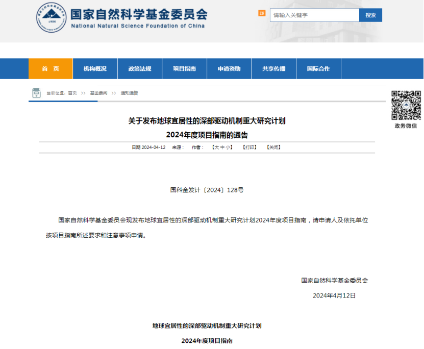 国家自然科学基金委员会现发布地球宜居性的深部驱动机制重大研究计划2024年度项目指南,请申请人及依托单位按项目指南所述要求和注意事项申请。