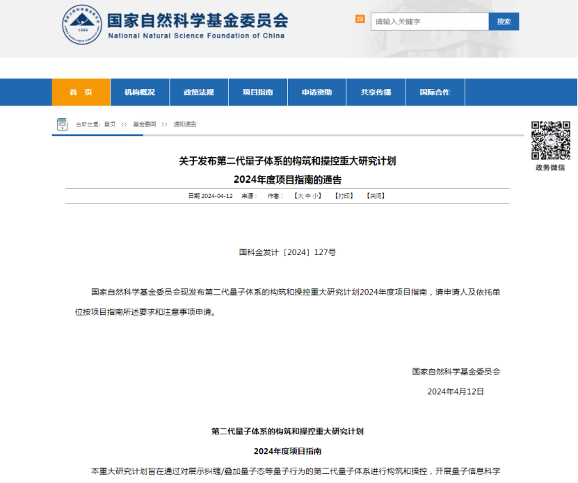 国家自然科学基金委员会现发布第二代量子体系的构筑和操控重大研究计划2024年度项目指南,请申请人及依托单位按项目指南所述要求和注意事项申请。