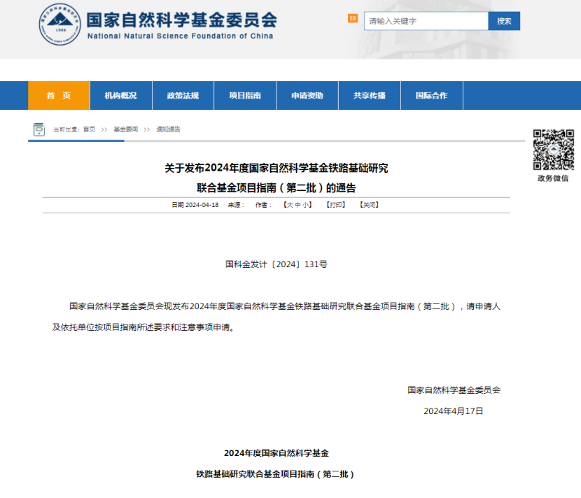 关于发布2024年度国家自然科学基金铁路基础研究联合基金项目指南(第二批)的通告