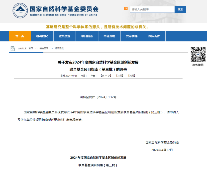 国家自然科学基金委员会现发布2024年度国家自然科学基金区域创新发展联合基金项目指南(第三批),请申请人及依托单位按项目指南所述要求和注意事项申请。