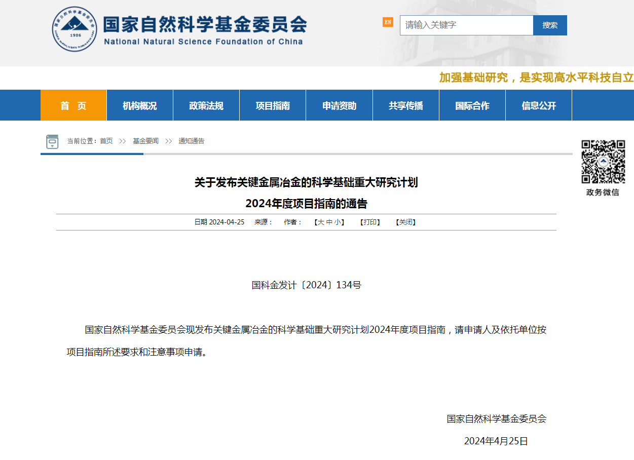 国家自然科学基金委员会现发布关键金属冶金的科学基础重大研究计划2024年度项目指南,请申请人及依托单位按项目指南所述要求和注意事项申请。