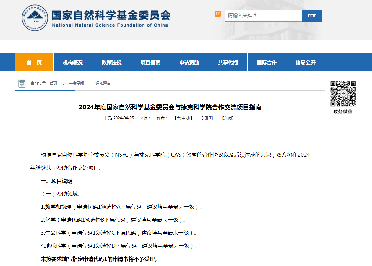 2024年度国家自然科学基金委员会与捷克科学院合作交流项目指南