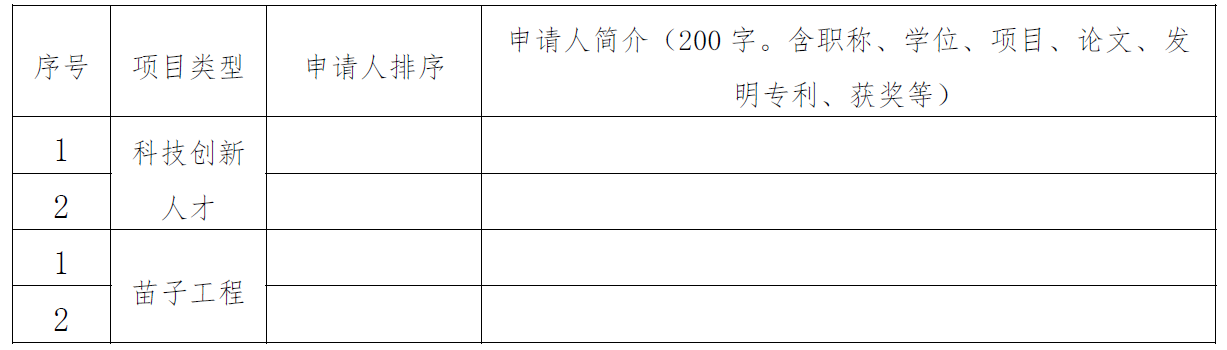 各理工学院截止于5月7日前参照全校限项指标(科技创新人才项目10项、苗子工程重点项目8项),填写以下申报计划表,统一交科研院择优遴选后通知学院正式申请人名单。