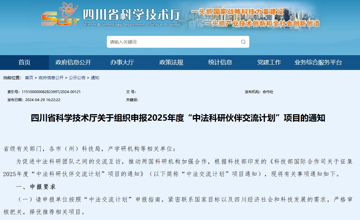 四川省科学技术厅关于组织申报2025年度“中法科研伙伴交流计划”项目的通知