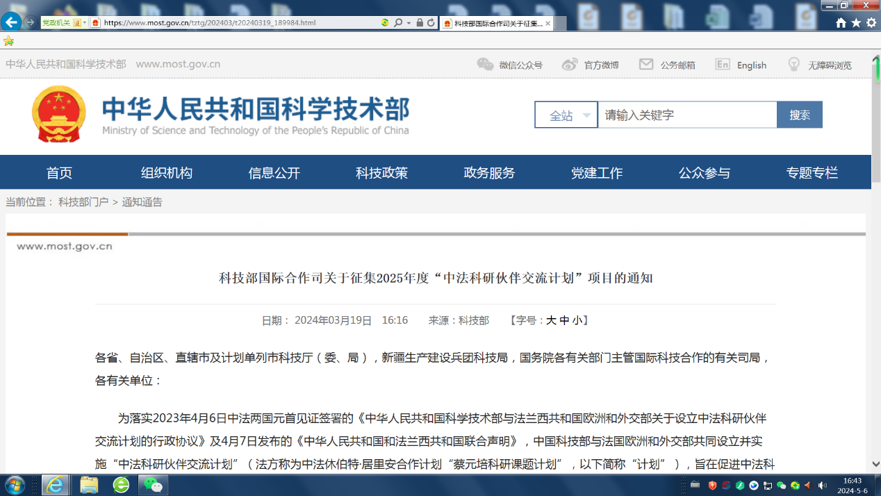 科技部国际合作司关于征集2025年度“中法科研伙伴交流计划”项目的通知