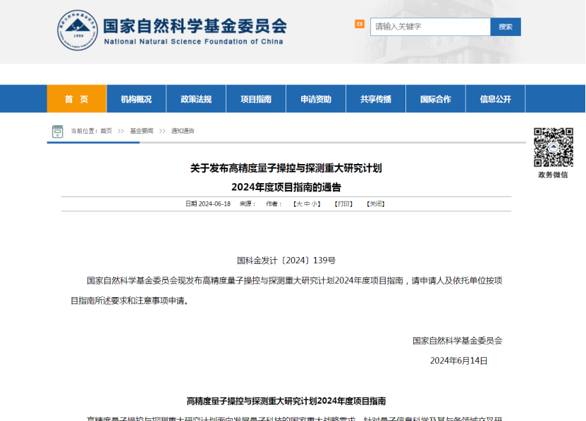 国家自然科学基金委员会现发布高精度量子操控与探测重大研究计划2024年度项目指南,请申请人及依托单位按项目指南所述要求和注意事项申请。