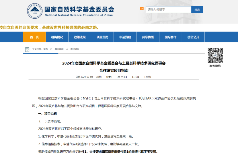 2024年度国家自然科学基金委员会与土耳其科学技术研究理事会