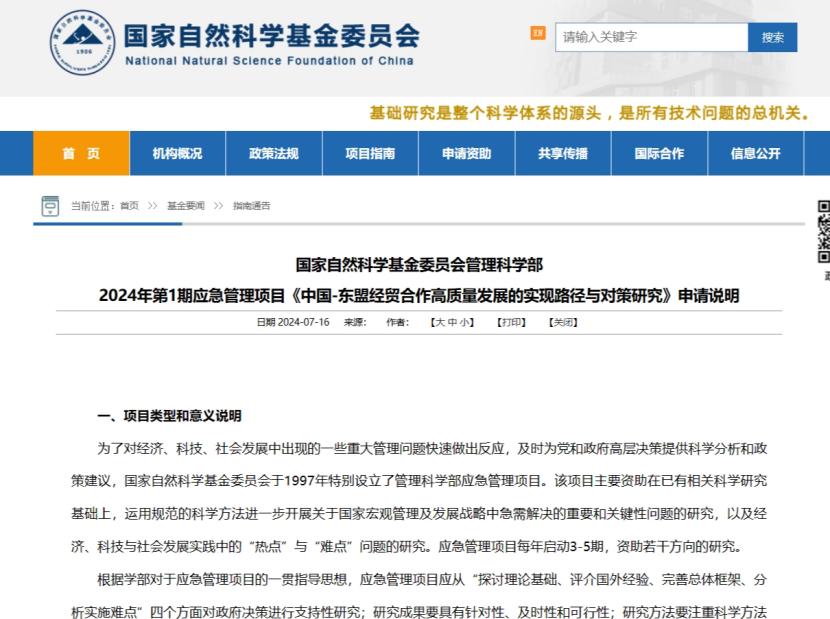 国家自然科学基金委员会管理科学部2024年第1期应急管理项目《中国-东盟经贸合作高质量发展的实现路径与对策研究》申请说明