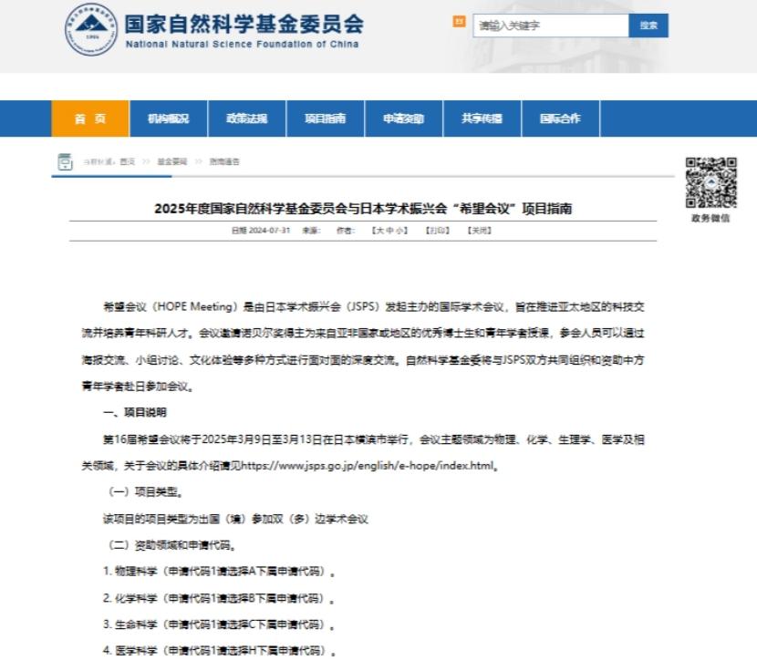 2025年度国家自然科学基金委员会与日本学术振兴会“希望会议”项目指南