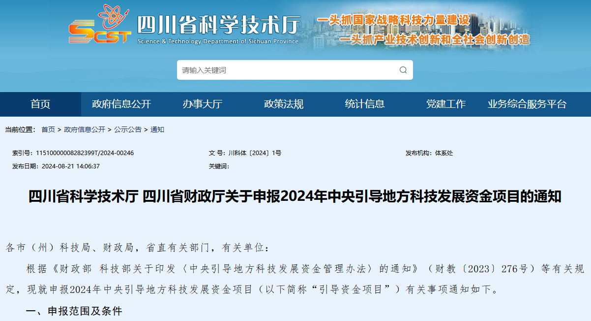 四川省科学技术厅 四川省财政厅关于申报2024年中央引导地方科技发展资金项目的通知