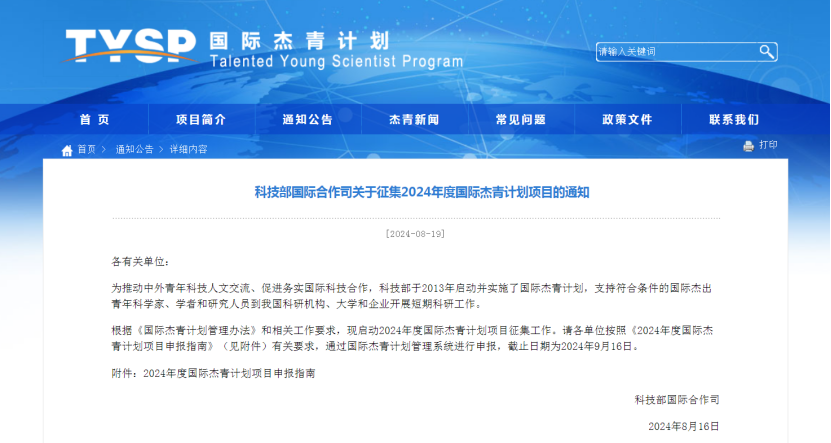 根据《国际杰青计划管理办法》和相关工作要求,现启动2024年度国际杰青计划项目征集工作。请各单位按照《2024年度国际杰青计划项目申报指南》(见附件)有关要求,通过国际杰青计划管理系统进行申报,截止日期为2024年9月16日。