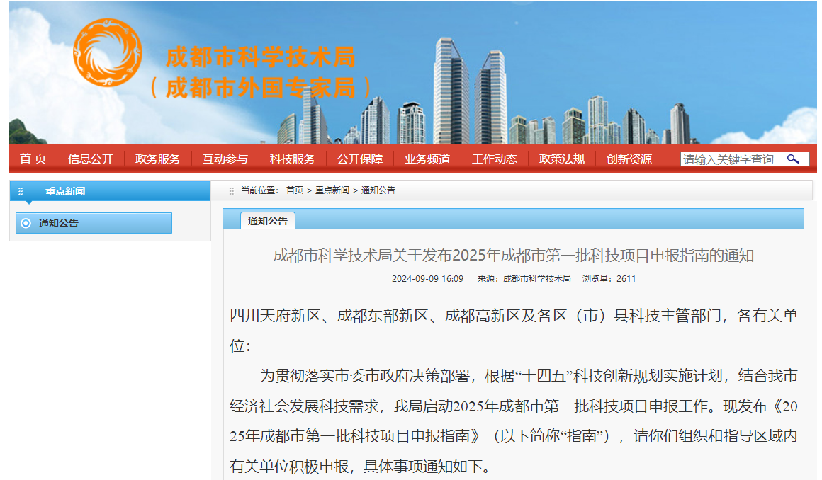 成都市科学技术局关于发布2025年成都市第一批科技项目申报指南的通知