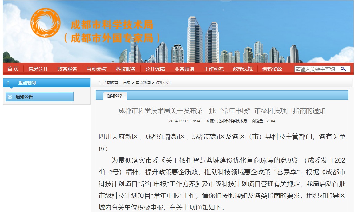 为贯彻落实市委《关于依托智慧蓉城建设优化营商环境的意见》(成委发〔2024〕2号)精神,提升政策惠企质效,推动科技领域惠企政策“蓉易享”,根据《成都市科技计划项目“常年申报”工作方案》及市级科技计划项目管理有关规定,我局启动首批市级科技计划项目“常年申报”工作,请你们按照通知及各类指南的要求,组织和指导区域内有关单位积极申报,有关事项通知如下。
