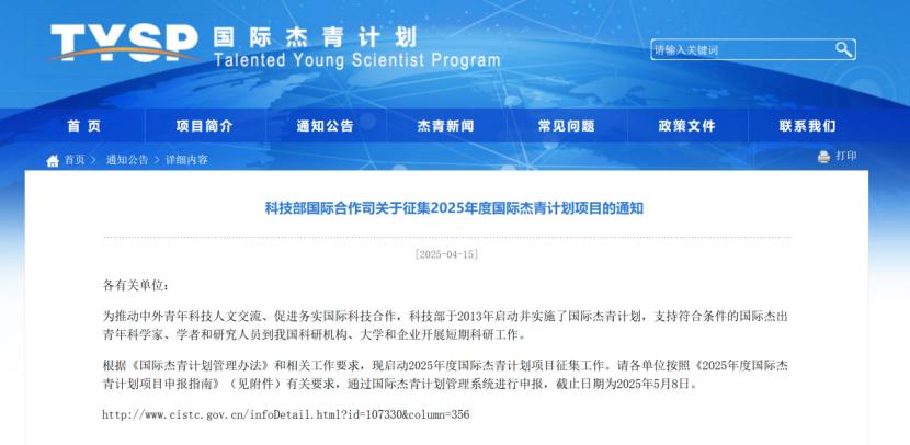 根据《国际杰青计划管理办法》和相关工作要求,现启动2025年度国际杰青计划项目征集工作。请各单位按照《2025年度国际杰青计划项目申报指南》(见附件)有关要求,通过国际杰青计划管理系统进行申报,截止日期为2025年5月8日。