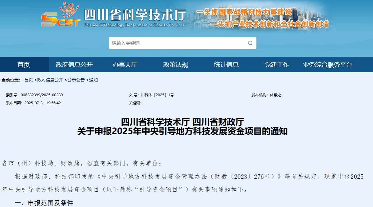 四川省科学技术厅 四川省财政厅关于申报2025年中央引导地方科技发展资金项目的通知