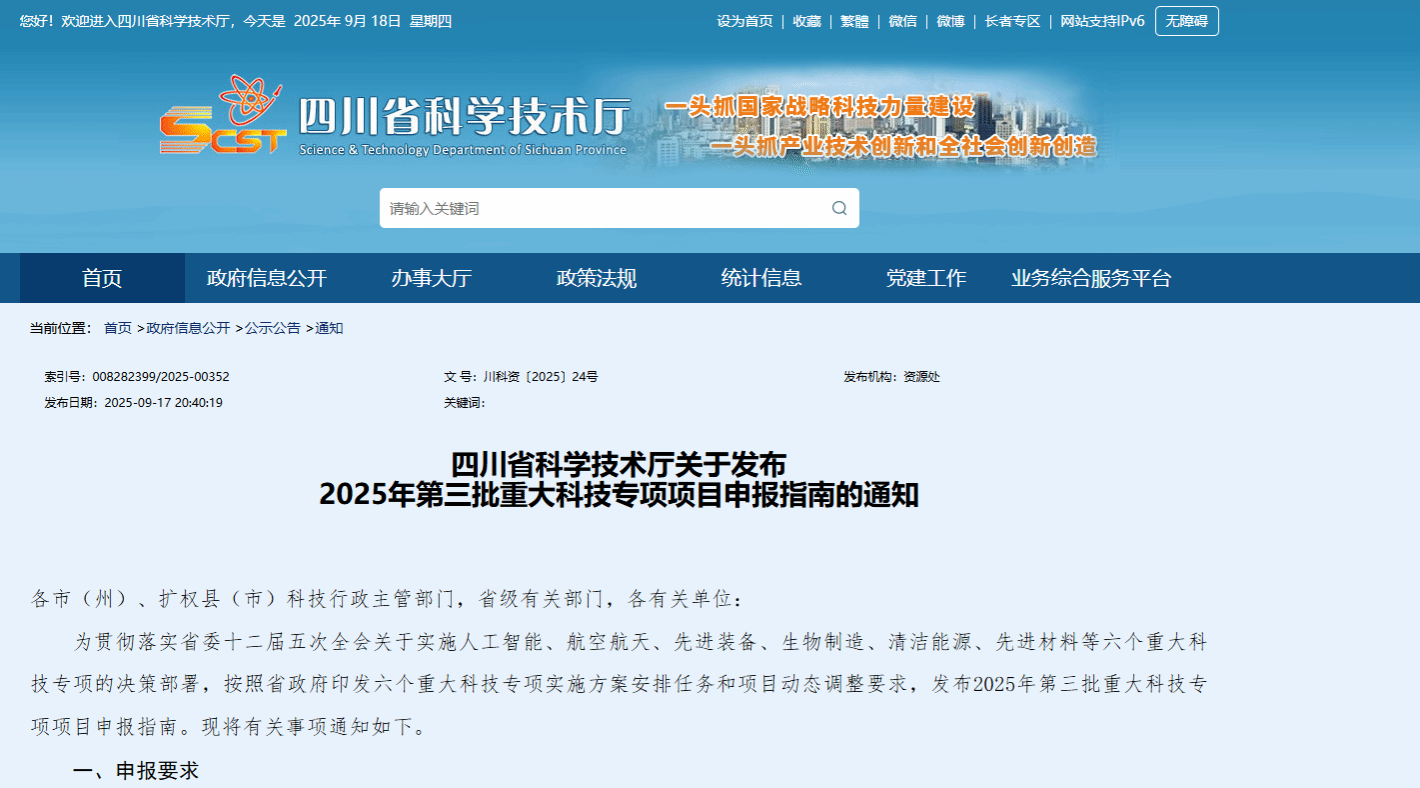 四川省科学技术厅关于发布2025年第三批重大科技专项项目申报指南的通知