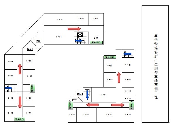 二、国重室内逃生线路请按箭头指示方向,按就近原则有序沿楼道撤离至生态停车场西侧干道。