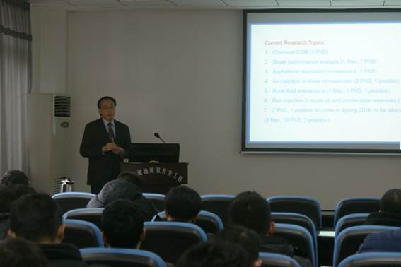 近日,实验室固定研究人员盛家平教授在国家重点实验室学术报告厅做了系列学术讲座,并就提高采收率、微观渗流、酸化压裂、储层保护、致密油气藏开发等内容与相关研究人员开展学科方向交流。12月22号、12月24号、12月28号、12月30号,盛家平教授在国家重点实验室A403学术报告厅分别做了“Determine Horizontal and Vertical Permeabilities From Probe-Type Formation Tests”、“Mobility Control Requirement in Enhanced Oil Recovery Processes ”、“Foamy Oil Flow”、“Teaching and Research in an American University”等四场学术讲座。盛教授介绍了探针式地层测试确定水平和垂向渗透率的2种方法、饱和度修正的驱替聚合物的流动性应小于或等于最小驱替相流动性的理论和现场应用、多孔介质泡沫油流动态过程数学模拟方法等。