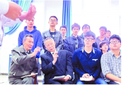 学校督导委专家袁祥忠(前排左二)、陈良浩(前排左一)随班听课,对青年教师的课堂教学进行点评