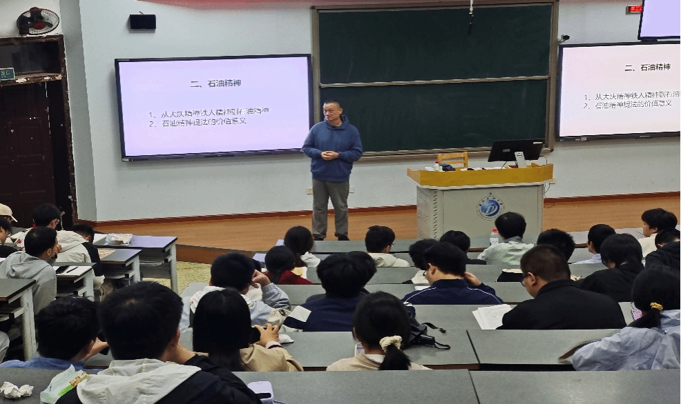 在此次党课中,喻滨教授以“石油精神石油魂”为核心主题,凭借深厚的学术积淀与生动的表达技巧,将理论阐释与互动交流巧妙融合。他在此次党课中主要讲述了在石油行业发展历程中,中国的石油人筚路蓝缕,在早期的中国石油行业中涌现出了一大批的拓荒者、先锋队、生力军以及主力军,同时喻教授引用了确切的先辈事例来更好地讲述我们石油行业的发展,其中包括翁文灏、孙崎越、李四光、曹本熹等人。喻教授指出,石油精神以“大庆精神”“铁人精神”“三老四严”为核心,具有深刻的精神底蕴,凝聚着石油人艰苦奋斗的决心、求真务实的态度与无私奉献的情怀。他希望全体同学们在习近平新时代中国特色社会主义思想伟大旗帜的指引下,将石油精神融入学习与生活中,努力学习专业知识,提升自身素养,做有理想、敢担当、能吃苦、肯奋斗的新时代好青年,在以中国式现代化全面推进中华民族伟大复兴的新征程中,以青春为翼驰骋万里,用奋斗为笔绘就华章。