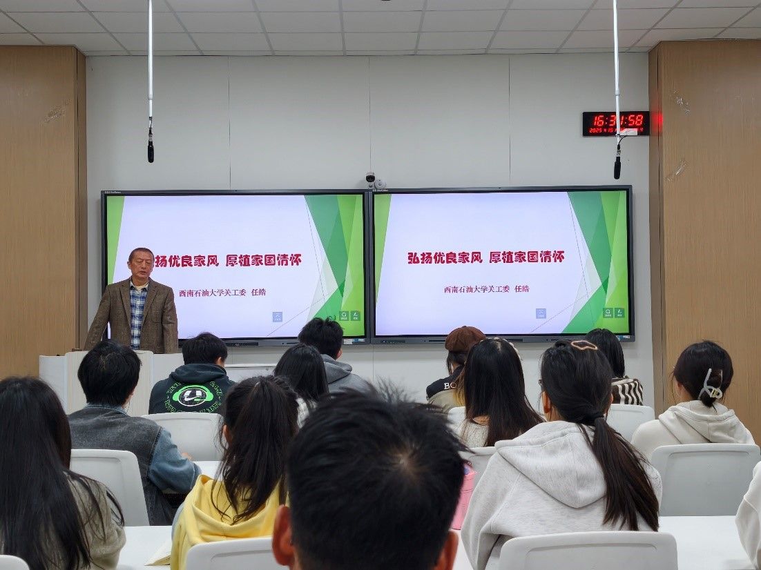 10月30日,新材院关工委在思学楼A111教室举办“弘扬优良家风·厚植家国情怀”专题讲座。西南石油大学关工委副主任、退休教师任皓教授担任主讲,新材院60余名入党积极分子参与学习。