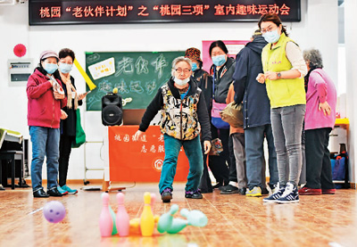 4月2日,在天津市河西区桃园街道居家养老服务中心二楼,一场别开生面的中老年人健康趣味运动会正在举行。来自社区的部分中老年人参加了保龄球、套圈、射箭等趣味项目活动。 史 嵩摄(人民视觉) |
