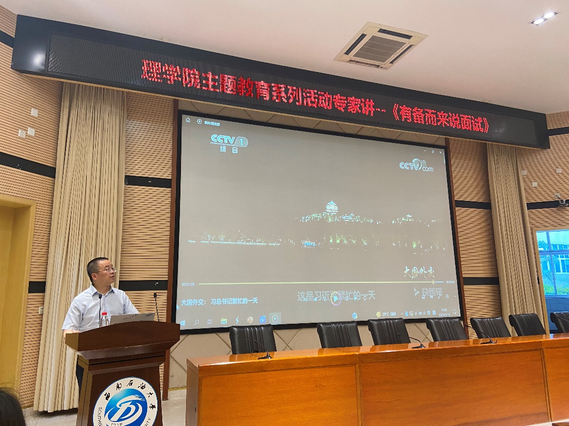 为扎实推进学习贯彻习近平新时代中国特色社会主义思想主题教育,进一步落实“守根本、育新人,抓重点、促发展,办实事、解民忧”等相关举措,帮助同学们进一步了解面试相关内容,提高学生的职场适应能力与就业成功率,5月18日晚7时,理学院在思学楼A114开展面试礼仪辅导讲座。讲座特别邀请到马克思主义学院党委副书记、面试礼仪培训专家林莉教授进行面试礼仪分享。讲座由理学院党委书记刘廷平主持,学院党委副书记王茂江、2020级辅导员李梦和理学院200余名同学聆听了讲座。