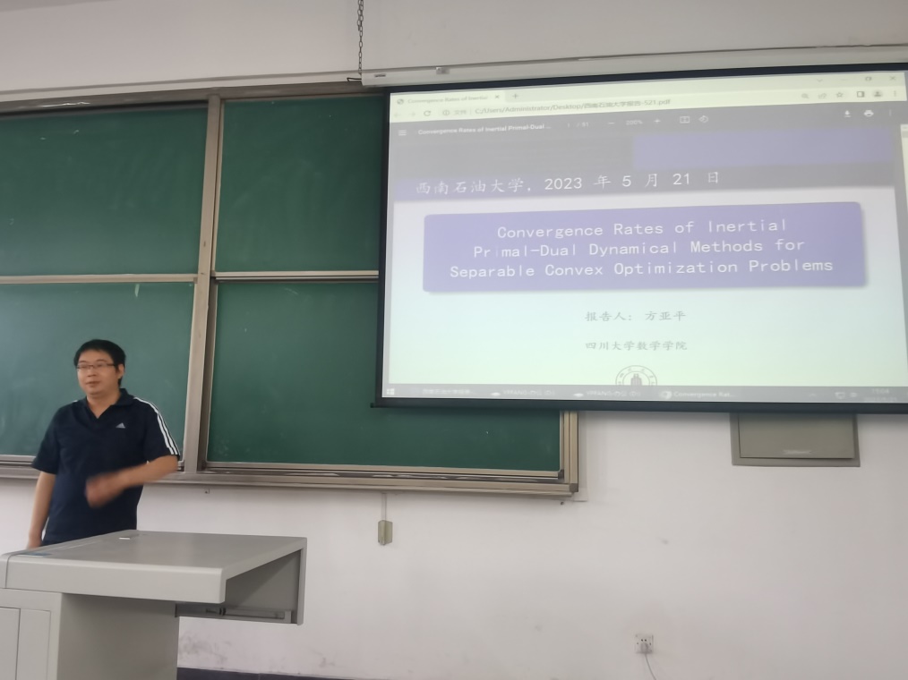 5月21日,四川大学方亚平教授应邀到我校作了题为《Convergence Rates of Inertial Primal-Dual Dynamical Methods for Separable Convex Optimization Problems》的学术报告,本次报告由理学院、人工智能研究院、非线性动力系统研究所、数理力学研究中心、科学技术发展研究院联合主办,由理学院吴新星教授主持,学院部分教师、学生聆听了讲座。