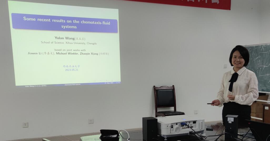 5月21日下午,西华大学王玉兰教授应邀到我校作了题为《Some recent results on the chemotaxis-fluid systems》的学术报告,本次报告由理学院、人工智能研究院、非线性动力系统研究所、数理力学研究中心、科学技术发展研究院联合主办,由理学院周彬教授主持,学院部分教师、学生聆听了讲座。