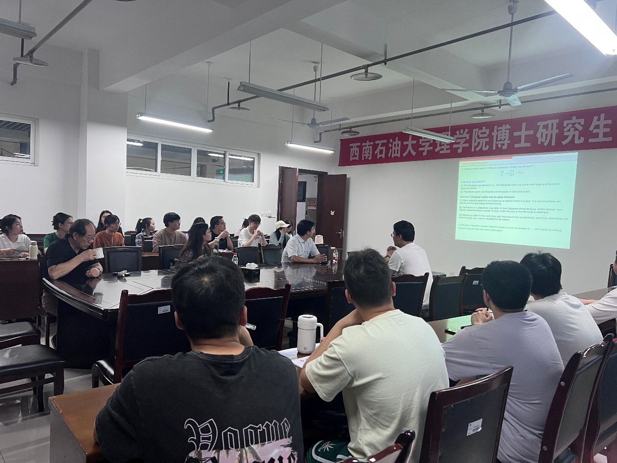 6月16日下午,西南大学黄启华教授应邀为我院师生作了题为“具有分散和平稳阶段的种群的混合抛物型和双曲型方程模型:适定性和种群持久性(A hybrid parabolic and hyperbolic equation model for a population with separate dispersal and stationary stages: well-posedness and population persistence)“的学术报告,报告会由理学院副院长闵超教授主持。
