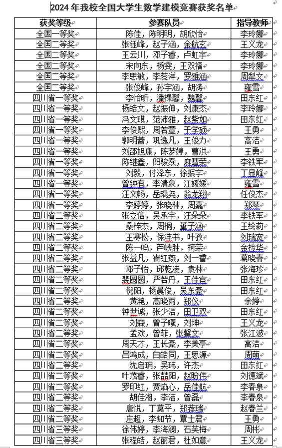 近日,全国大学生数学建模竞赛组委会公布了2024高教社杯全国大学生数学建模竞赛获奖名单,我校共有6支参赛队伍获得全国奖,其中由理学院李玲娜教授指导的参赛队(学生:理学院陈佳、胡欣怡,计软院陈明明)荣获全国一等奖,另外5支队伍获得全国二等奖。此外,我校还有11支参赛队伍获得四川省一等奖,20支参赛队伍获得四川省二等奖,2支参赛队伍获得四川省三等奖。