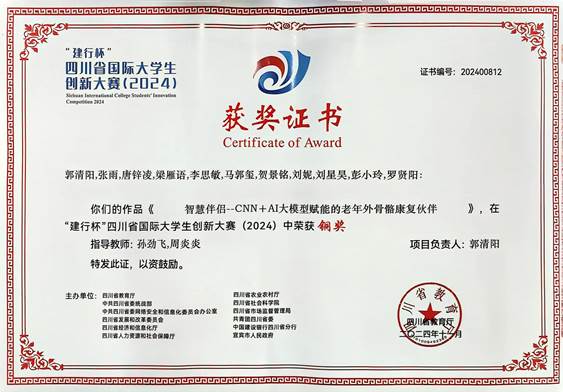 近日,四川省教育厅公布了“建行杯”四川省国际大学生创新大赛(2024)的获奖名单,理学院人工智能专业郭清阳同学牵头的参赛团队以“智慧伴侣-CNN+AI大模型赋能的老年外骨骼康复伙伴”项目斩获铜奖。