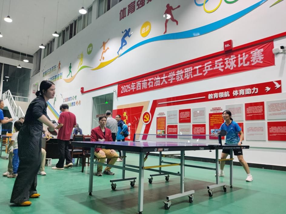 金秋十月,西南石油大学 2025 年教职工乒乓球赛于 10月13 日在体育馆开赛。理学院选派陈亚丽、杨晓英、邹其徽、李春泉四位教师,与地科院组成联合队参赛。
