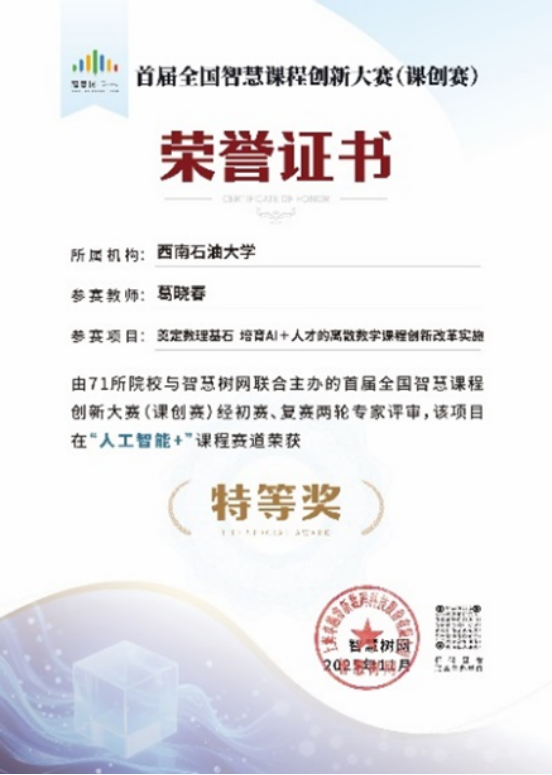 近日,首届“智慧树杯”全国智慧课程创新大赛结果正式揭晓。我院青年教师葛晓春主讲的《离散数学》课程凭借突出的教学创新成果,荣获大赛特等奖。