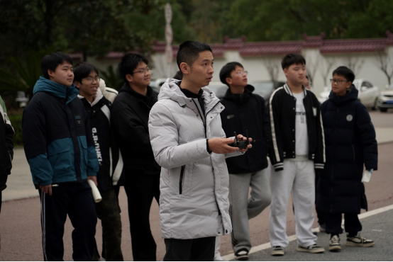 理论讲解结束后,活动进入了最令人期待的实践环节。在马欣老师的专业指导和保障下,四旋翼无人机在操场上腾空而起,进行了精彩的飞行表演。无人机时而灵巧悬停,时而高速穿梭,稳定的性能和精准的控制赢得了师生们的热烈掌声。随后,同学们在“一对一”指导下,亲手尝试操控无人机,体验飞行的乐趣。当操纵杆被轻轻拨动,无人机随之做出响应时,同学们眼中充满了兴奋与好奇的光芒。
