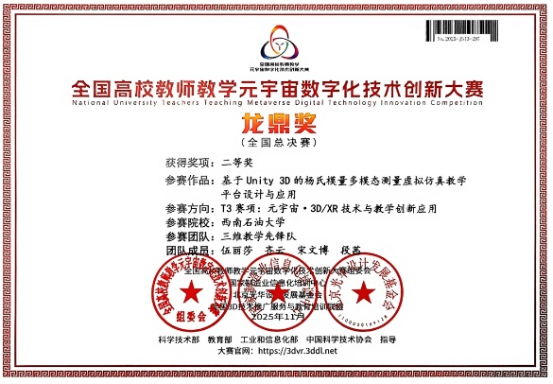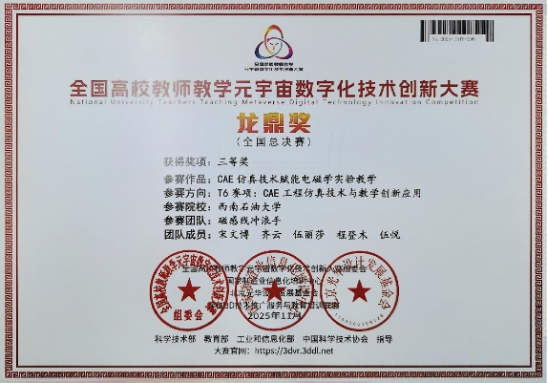 两项成果紧扣大赛“数智赋能教学”导向,充分展现了我院在教育数字化转型中的创新实践能力。其中,在T3赛项(元宇宙·3D/XR 技术与教学创新应用)中,我院教师伍丽莎、齐云、宋文博、段茜围绕专业课程开发沉浸式虚拟仿真实验资源,荣获全国二等奖;在T6赛项(CAE 工程仿真技术与教学创新应用)中,我院教师宋文博、齐云、伍丽莎、程登木、伍悦将多物理场仿真技术融入基础物理实验教学,有效提升教学可视化与安全性,荣获全国三等奖。