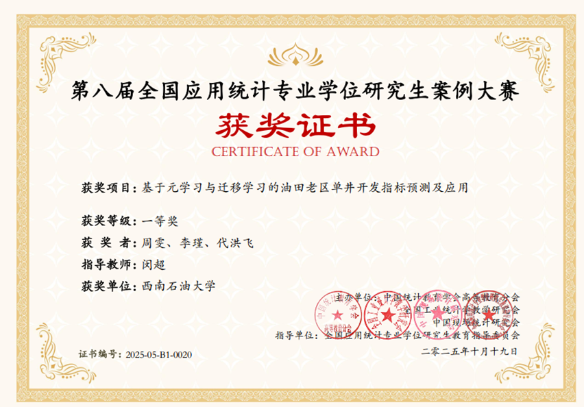 我院研究生周雯、李瑾、代洪飞三位同学共同完成的案例作品“基于元学习与迁移学习的油田老区单井开发指标预测及应用”荣获全国一等奖,入选“全国应用统计专业学位教育教学案例库”。