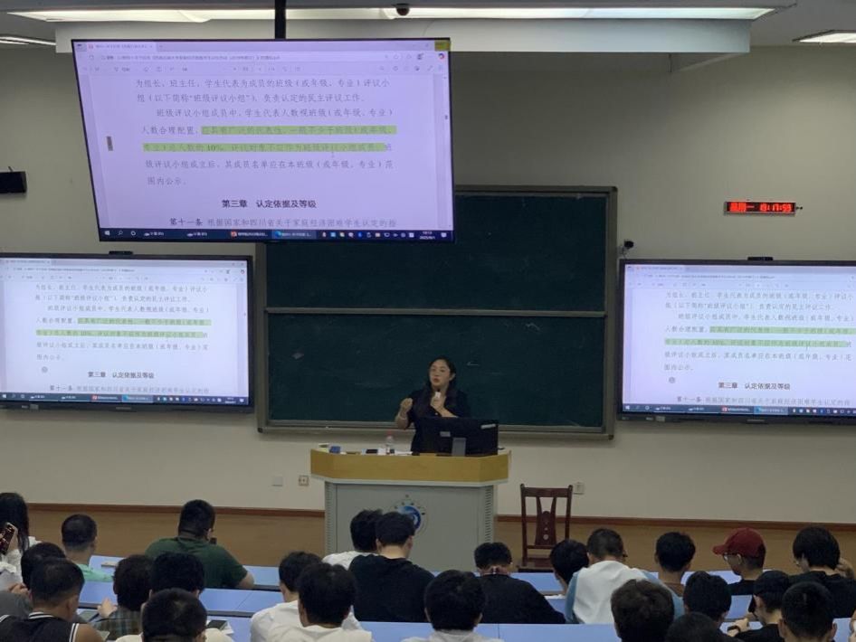 紧接着,周缘细致解读新学期各项任务要求,明确任务节点、工作标准与提交规范。其中详细重申家庭经济困难学生认定工作流程、所需材料及填报注意事项,确保资助政策精准落地、惠及有需。周缘还进一步围绕考研备考、留学深造、就业求职、应征入伍等多元方向,为同学们提供指导与建议,并通过问卷调查再次摸排全体同学的毕业去向,为精准对接大家的发展需求、后续开展个性化指导做好准备。