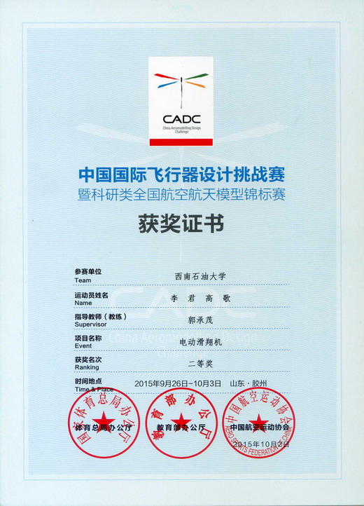经过平日的艰苦训练和假期的集训,我校选手在继7月四川绵阳分站赛获奖后,再次在全国比赛中取得多项佳绩,分别获得了“电动滑翔机”项目男子组和女子组二等奖,“对地侦查”项目三等奖,“垂直起降载运”项目三等奖以及“太阳能飞机”项目第六名。