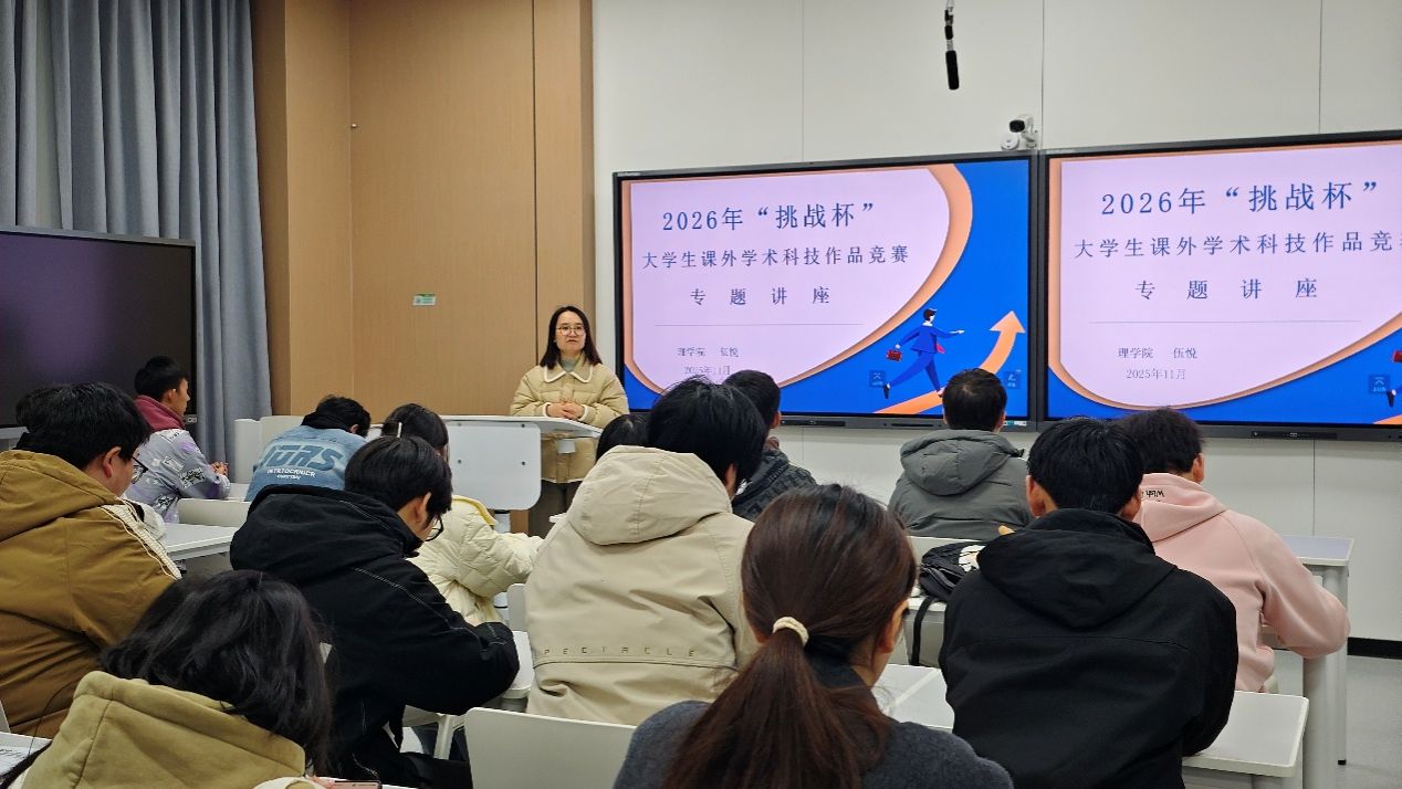 为激发学生科研热情,提升创新创业能力。于2025年11月5日晚7点,理学院在明理楼B101教室成功举办2026年“挑战杯”大学生课外学术科技作品竞赛专题讲座。本次讲座由理学院团委书记伍悦主讲,吸引了来自各年级的本科生和研究生积极参与。