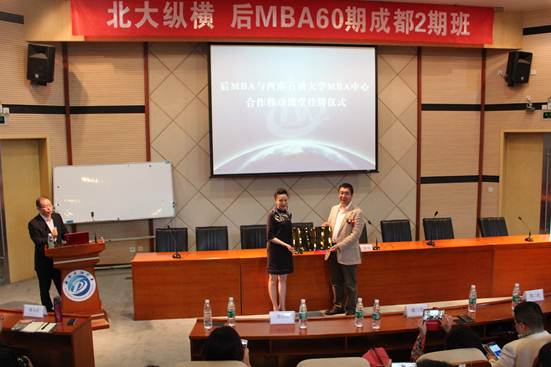 18日下午,举办了北大纵横后MBA60期成都2期班正式开班,在开班仪式开始之前,经管学院副院长、MBA中心主任吴晓明代表学校向王璞先生颁发了客座教授聘书;同时,王璞先生也向西南石油大学MBA中心授予北大纵横后MBA移动课堂基地的牌匾,这将进一步丰富学校MBA教学的形式,提升教学质量,对MBA教育与发展具有里程碑意义。