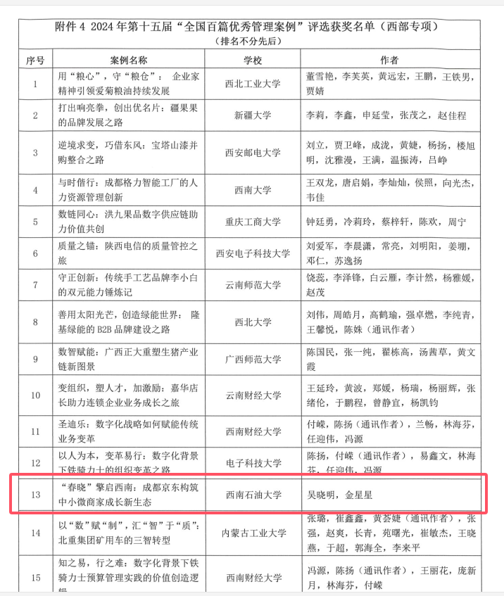 2024年9月9日,中国管理案例共享中心公布了第十五届“全国百篇优秀管理案例”获奖名单,我中心吴晓明教授团队编写的案例入选“全国百篇优秀管理案例”西部专项。