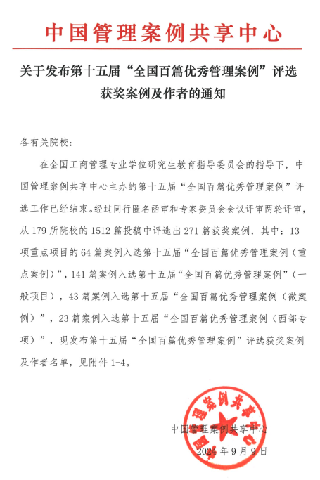 “全国百篇优秀管理案例”评选由全国工商管理专业学位研究生教育指导委员会指导、中国管理案例共享中心主办,是我国管理案例评选的最高奖项,已被纳入工商管理硕士专业学位研究生教育水平评估指标体系。